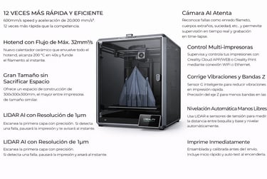 La Creality K1 Max es una impresora 3D de alto rendimiento diseñada para velocidad y precisión. Ofrece un gran volumen de impresión de 300×300×300 mm, tecnología CoreXY de alta velocidad y nivelación automática inteligente. Ideal para profesionales que buscan producir piezas grandes y detalladas en menos tiempo, con resultados confiables y de alta calidad.