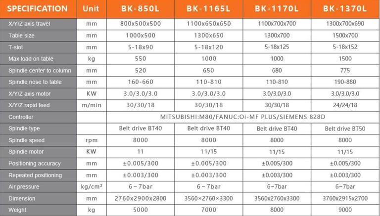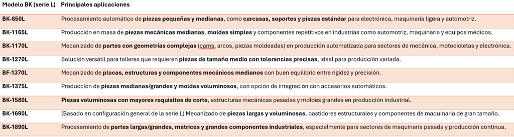 La serie BK ofrece una solución versátil desde piezas pequeñas hasta piezas voluminosas, con buena precisión y relaciones costo‑beneficio para producción en talleres y pymes industriales.